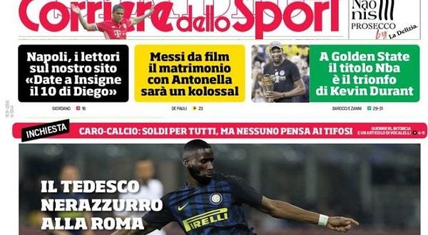 Il Corriere dello Sport apre con: “Rudiginter“, il riferimento è per il difensore tedesco della Roma verso l’Inter. In taglio alto ecco la Juventus e l’affare Douglas Costa, mentre in basso spazio al Napoli con un sondaggio ai lettori che esprimono il loro pensiero: “Date ad Insigne il 10 di Diego“.