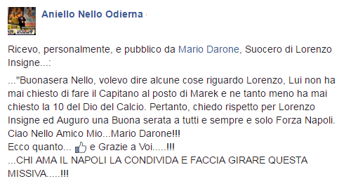 “Volevo dire alcune cose riguardo Lorenzo, lui non ha mai chiesto di fare il capitano al posto di Marek e tanto meno ha mai chiesto la 10 del Dio del calcio. Pertanto, chiedo rispetto per Lorenzo Insigne ed auguro una buona serata a tutti e sempre e solo Forza Napoli.”