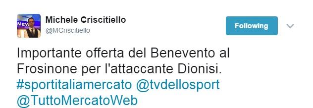 “Il Benevento – scrive Criscitiello – ha fatto un’offerta importante al Frosinone per l’attaccante Federico Dionisi“.