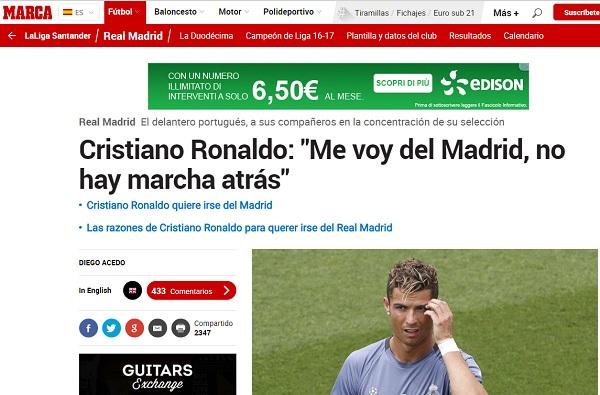 In attesa di capire se davvero qualche club sia in grado di sborsare tale cifra, dalla Spagna arrivano fortissime conferme sul possibile addio di CR7 ai blancos. Il prestigioso quotidiano Marca, nella sua versione online, ha infatti pubblicato alcune frasi che l’attaccante avrebbe rivelato ai compagni di Nazionale, con cui disputerà la Confederedions Cup, commentando la notizia di “A Bola”: “Me ne vado dal Real Madrid, ormai ho deciso. Non tornerò indietro sulla mia decisione“.