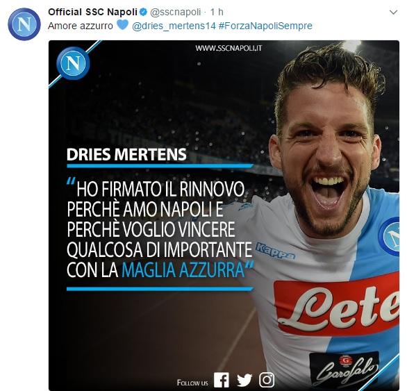 Il club ha così voluto ringraziare il belga con un post su Twitter scrivendo semplicemente: “Amore azzurro 💙 @dries_mertens14 #ForzaNapoliSempre“.