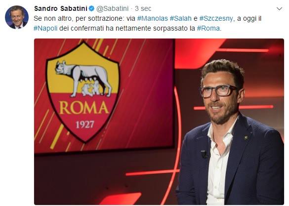 Ecco il tweet: “Se non altro, per sottrazione: via Manolas, Salah e Szczesny, a oggi il Napoli dei confermati ha nettamente sorpassato la Roma“.