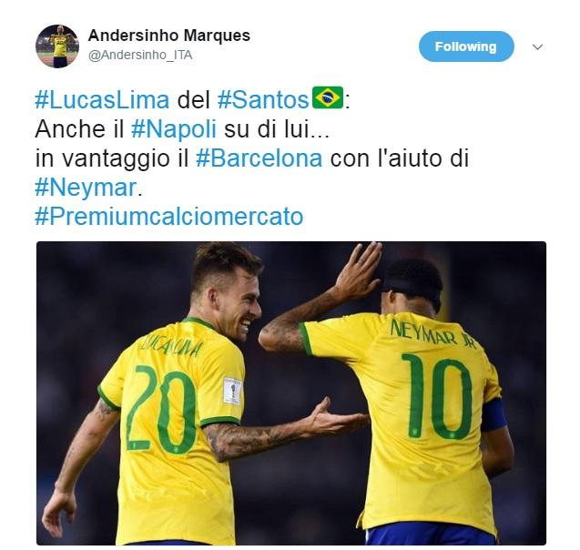 Il commentatore brasiliano di Premium Sport, Andersinho Marques ha svelato alcune indiscrezioni del mercato del Napoli, sul suo profilo Twitter.