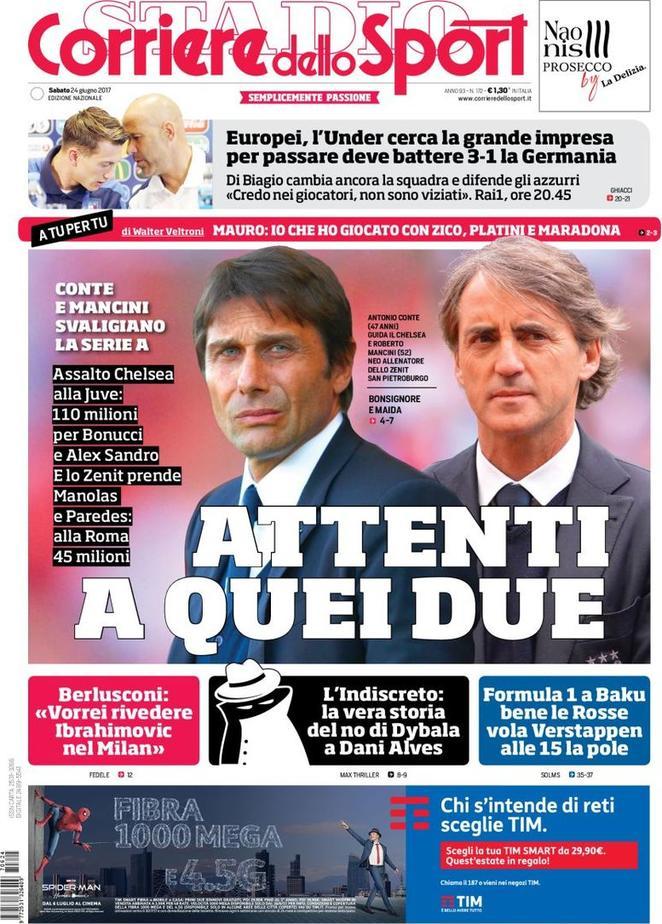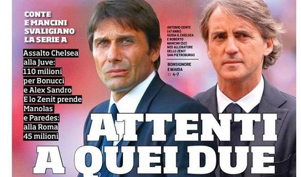 Il Corriere dello Sport apre con: “Attenti a quei due“, riferito all’assalto di Conte e Mancini ai gioielli della Serie A. In taglio alto: “Europei, l’Under cerca l’impresa. Per passare deve battere 3-1 la Germania“.