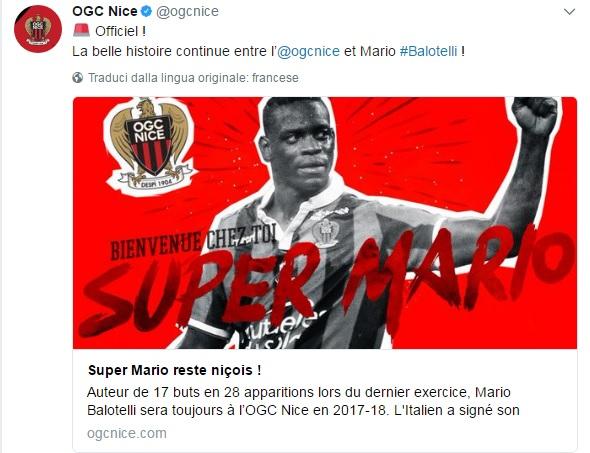 A dare l’annuncio è stato lo stesso club francese poco fa attraverso il suo sito ufficiale. “Balotelli, autore di 17 gol nell’ultima stagione, – si legge nel comunicato diffuso dal Nizza – ha deciso di rinunciare ad altre importanti offerte (si era vociferato del Borussia Dortmund, ndr) e ha sposato i nostri colori anche per la prossima stagione“.