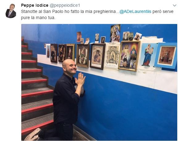 Iodice ha però voluto fermarsi sotto la scalinata dove sono presenti le immagini dei vari Santi che spesso sono oggetto di devozione da parte degli stessi calciatori. Ebbene non poteva mancare anche una preghiera di Iodice che, evidentemente, ha chiesto la vittoria dello Scudetto. Particolare poi il commento che chiama in causa il presidente De Laurentiis: