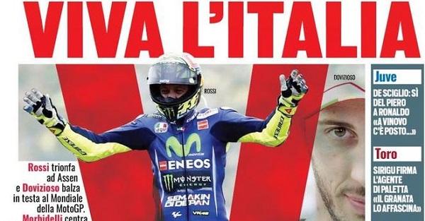 Tuttosport, invece, dedica la prima pagina alle gioie italiane: “Viva l’Italia” tra moto e Under 21. Poi spazio alla Juventus con Del Piero che chiama Cristiano Ronaldo: “A Vinovo c’è posto…“.