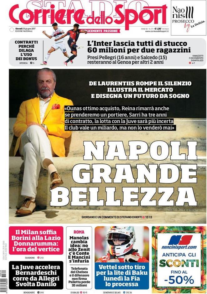 La prima pagina del Corriere dello Sport è dedicata a De Laurentiis, che in un’intervista ha analizzato le strategie di mercato del club partenopeo: “Napoli grande bellezza“. In taglio alto spazio all’Inter: “L’Inter lascia tutti di stucco: 60 milioni per due ragazzini“.