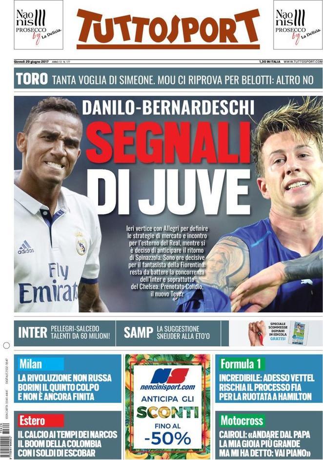 Tuttosport, invece, apre con il mercato della Juventus: “Danilo-Bernardeschi, segnali di Juve“. In taglio alto spazio al mercato del Torino: “Tanta voglia di Simeone. Mou ci prova per Belotti: altri no“.