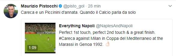 Il tutto è stato esaltato dal giornalista Maurizio Pistocchi che sul suo account Twitter ha commentato così il video: “Careca e un Piccinini d’annata. Quando il Calcio parla da solo“.