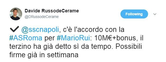 AGGIORNAMENTO 16.40 – Il giornalista de Il Corriere dello Sport, Davide Russo De Cerame, ha pubblicato su Twitter un aggiornamento sulla vicenda Mario Rui. I partenopei pare abbiano ancora alzato l’offerta per avere l’esterno portoghese: la nuova proposta prevede 10 milioni più bonus da versare nelle casse dei giallorossi. In pratica il Napoli ha alzato sensibilmente (circa 1 milione) la parte fissa della proposta fatta nelle scorse ore, tenendo inalterata la parte relativa a bonus. Questa mossa potrebbe essere decisiva per il buon esito dell’affare. Già nella prossima settimana potrebbe arrivare l’ufficialità dell’acquisto.