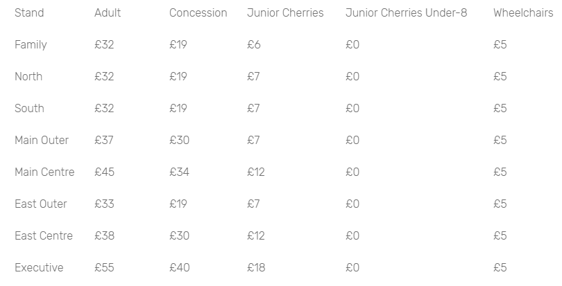 I fan degli Cherries potranno godere di alcune agevolazioni per le gare casalinghe con l’ acquisto del biglietto per la gara amichevole con il Napoli. Il costo dei biglietti sarà quello solito delle gare di Premier League, come riportato nella tabella sottostante.