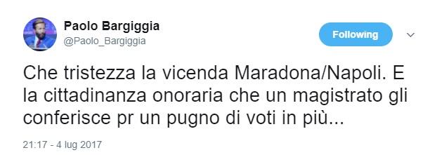 “Che tristezza la vicenda Maradona/Napoli – scrive su Twitter – E la cittadinanza onoraria che un magistrato gli conferisce per qualche voto in più”.