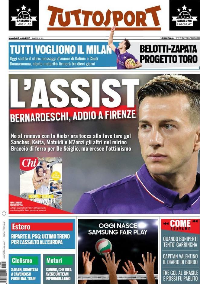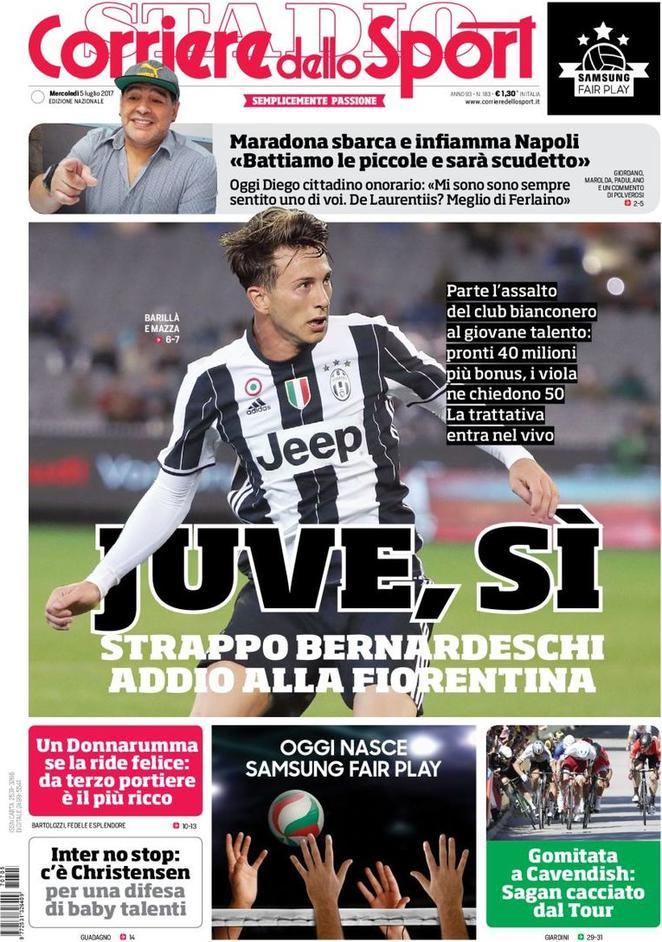 Una nuova giornata di sport è pronta a sorgere. I quotidiani sportivi e non di domani dedicano spazio al mercato, con Tuttosport e il Corriere dello Sport che aprono con l’affare Bernardeschi-Juve. L’accordo tra il calciatore e il club bianconero c’è, quello con la Fiorentina va cercato ma si troverà.