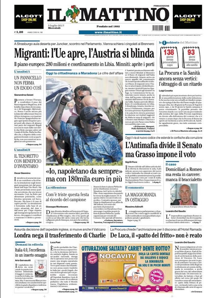 Il Mattino, invece, si scaglia contro Maradona, che si è definito “napoletano da sempre”. Facile a dirsi – secondo il quotidiano – quando la comparsata a piazza del Plebiscito frutterà 180 mila euro.