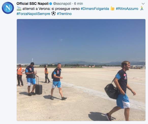 11.16 – Ci siamo, oggi inizia ufficialmente il ritiro del Napoli a Dimaro Folgarida, in Trentino. La squadra viaggia in aereo fino a Verona, per poi arrivare all’Hotel Rosatti in autobus. Sia il club che i giocatori, attraverso i loro profili social, hanno pubblicato alcuni scatti prima della partenza.