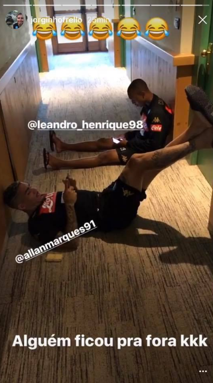 Il clima è dei più allegri e distesi in casa Napoli. Il gruppo azzurro, reduce dall’allenamento mattutino, sta approfittando di alcune ore di riposo per riprendersi dalle intense sedute degli ultimi due giorni. Tra i più attivi, dal punto di vista dei social, è senza dubbio Jorginho che, attraverso una foto pubblicata su Instagram, scherza sulle condizioni di Allan e Leandrinho, a quanto pare costretti all’esterno della propria stanza nell’Hotel Rosatti.