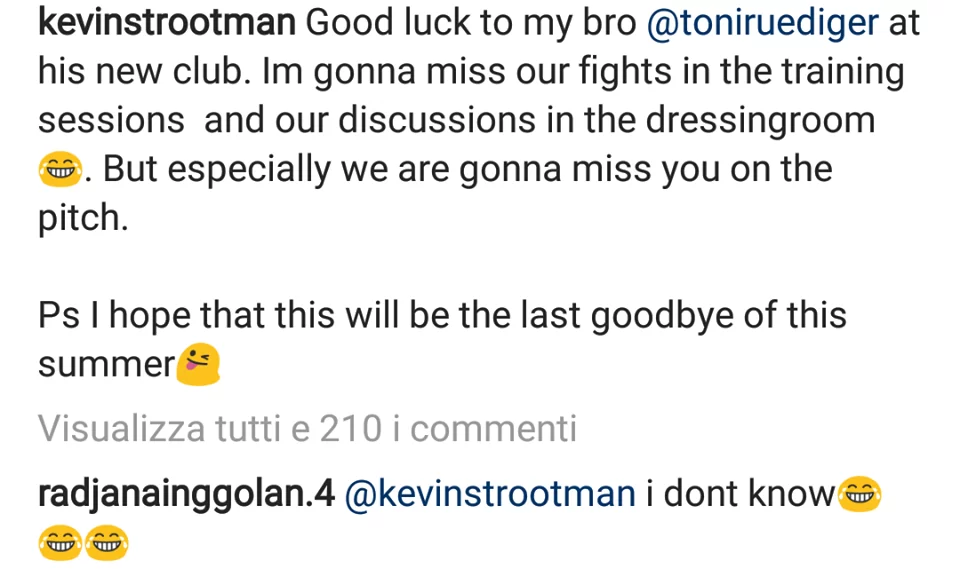 L’addio di Rudiger è la seconda dura perdita per la Roma di Di Francesco. Dopo Paredes, il difensore tedesco è stato ufficializzato dal Chelsea. L’ex compagno di squadra Kevin Strootman gli ha dedicato un post per augurargli buona fortuna, concludendo con una frase criptica: “Speriamo sia l’ultimo addio di questa estate”.
