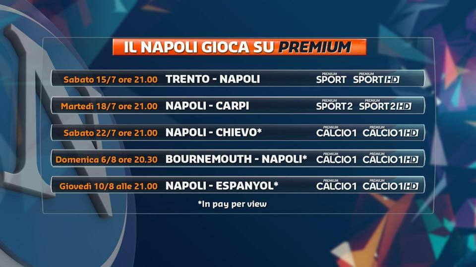 Da segnalare, soprattutto, il fatto che le sfide Trento-Napoli e Napoli-Carpi saranno assolutamente gratuite, a differenza degli impegni più blasonati con Chievo, Bournemouth ed Espanyol, i quali saranno visibili sulla piattaforma solo in modalità pay-per-view, ovvero a fronte di un pagamento.