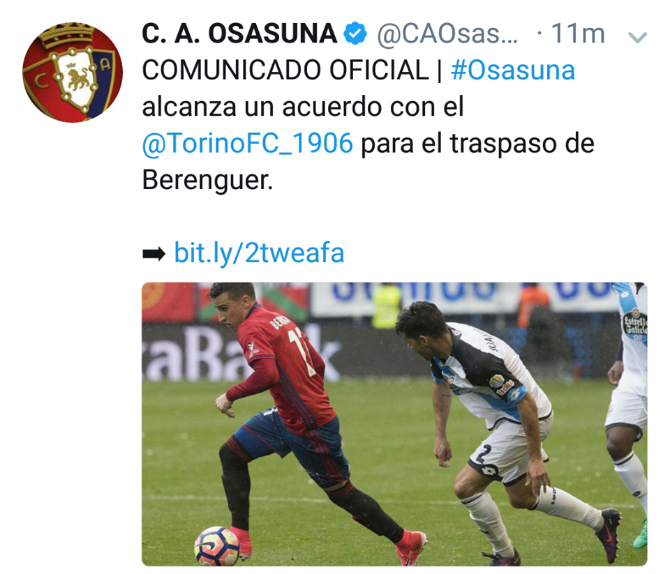 Clamoroso il colpo di scena che arriva dalla Spagna. Alex Berenguer non sarà un calciatore del Napoli. Lo ha comunicato l’Osasuna sul proprio profilo Twitter, mettendo in chiaro l’accordo con il Torino. Insomma il club granata ha letteralmente beffato il Napoli, concludendo la trattativa sotto banco.