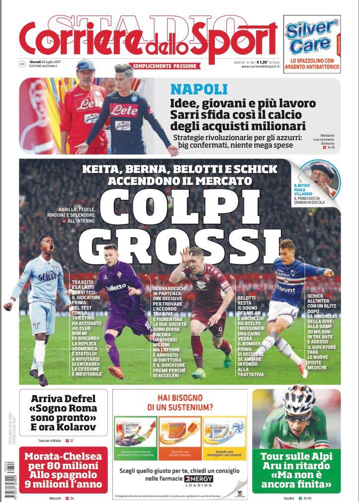 Il Corriere dello Sport dedica la sua prima pagina a quattro possibili “Colpi grossi” come Bernardeschi, Keita, Schick e Belotti. In taglio alto la politica del Napoli: “Idee giovani e più lavoro, così Sarri sfida il calcio degli acquisti milionari“.