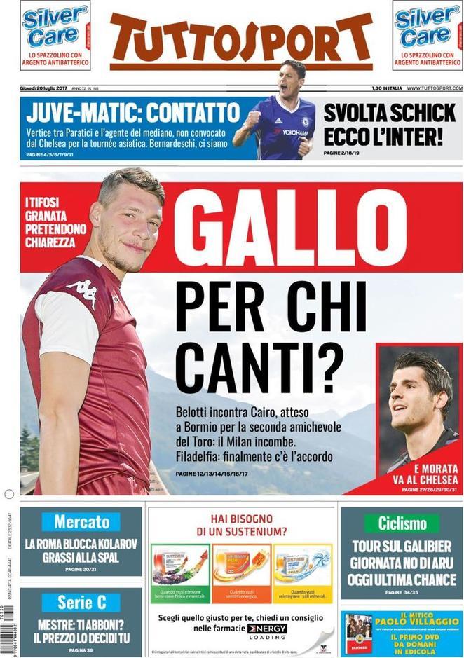 Tuttosport apre con: “Gallo, per chi canti?“, riferendosi a Belotti e al suo possibile trasferimento dal Torino al Milan. In taglio alto: “Juve-Matic, contatto. Svolta Schick, ecco l’Inter“. In taglio basso anche una notizia che riguarda il Napoli: “Grassi alla Spal“.