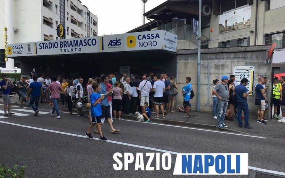 Nella giornata di oggi sono accorsi tantissimi tifosi azzurri, colti alla sprovvista dall’assenza di tagliandi. In un attimo è montata la protesta dei tanti sostenitori insoddisfatti. Rimostranze che però hanno ottenuto un’apertura della società del Trento, di concerto con le istituzioni locali, che hanno concesso circa 150 biglietti aggiuntivi, raggiungendo il limite della capienza dell’impianto, come raccolto in esclusiva dal direttore di SpazioNapoli Antonio Manzo durante la trasmissione Dimaro per primi in onda su Tv Luna.
