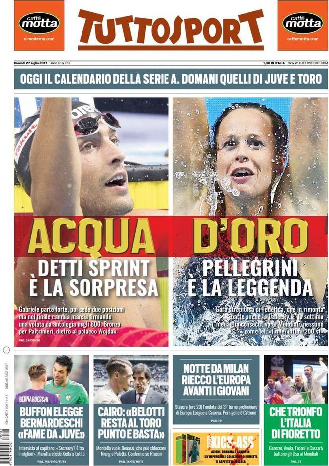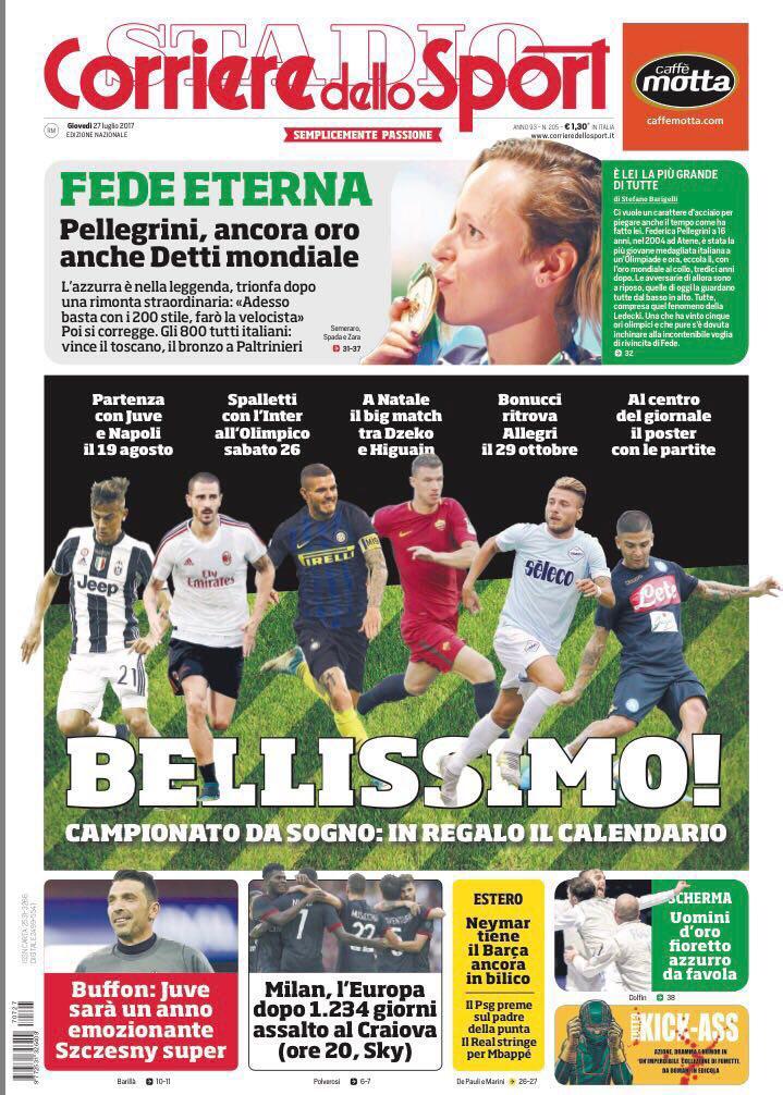 Le prime pagine dei quotidiani sportivi si concentrano sul calendario 2017/18 di Serie A. Non mancano anche alcuni riferimenti al calciomercato.