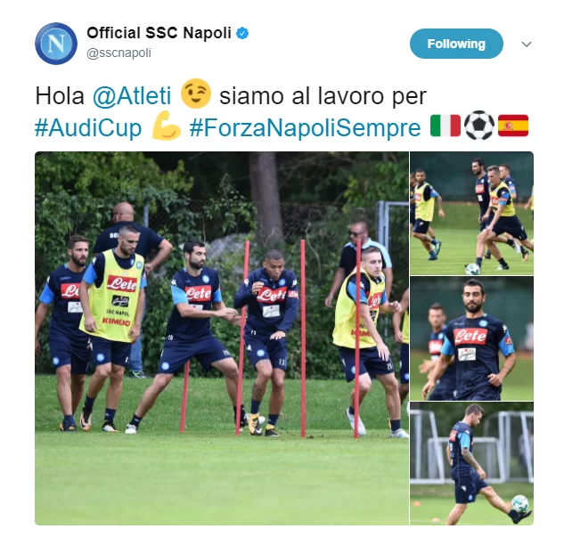 A questo proposito, il profilo Twitter del Napoli regala una chicca: “Hola Atletico” – si legge – “Noi siamo al lavoro per l’Audi Cup!”