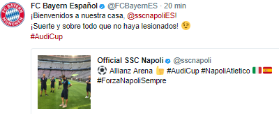 I bavaresi hanno dato il benvenuto ai partenopei con un tweet pubblicato sulla propria pagina ufficiale in spagnolo: “Benvenuti nella nostra casa. In bocca al lupo e soprattutto che non si siano infortuni”.