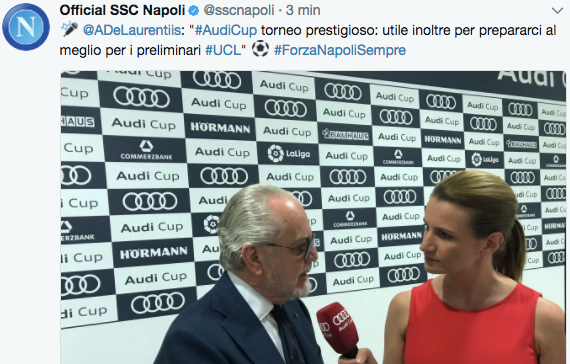 A pochi minuti dall’inizio del match tra il Napoli e l’Atletico Madrid, valevole per la prima semifinale dell’Audi Cup, ha parlato il presidente Aurelio De Laurentiis. Poche parole, ma molto intense e significative, riportate dal profilo ufficiale Twitter del club partenopeo.