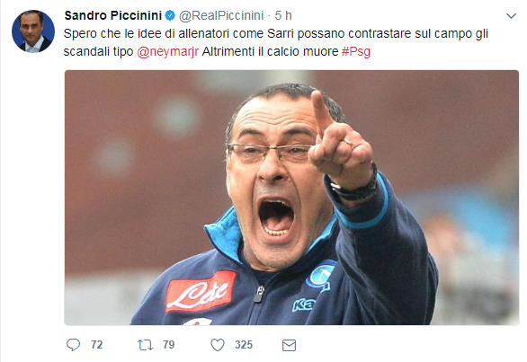 Continuano a giungere, imperterriti, gli attestati di stima verso il lavoro di Maurizio Sarri. Il tecnico del Napoli, grazie anche all’ultima stagione alla guida degli azzurri, è riuscito a far apprezzare la propria semplicità. L’ultimo apprezzamento, in ordine di tempo, giunge dal collega Sandro Piccinini che, attraverso la propria pagina di Twitter, ha lanciato un messaggio splendido: “Spero che le idee di allenatori come Sarri possano contrastare sul campo gli scandali tipo Neymar. Altrimenti il calcio muore”.