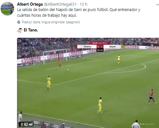Il giornalista spagnolo Albert Ortega ha commentato attraverso il proprio profilo Twitter il giro palla basso degli azzurri, con tanto di video: “L’uscita della palla del Napoli di Sarri è puro calcio. Quante ore di lavoro dell’allenatore ci sono qui”.