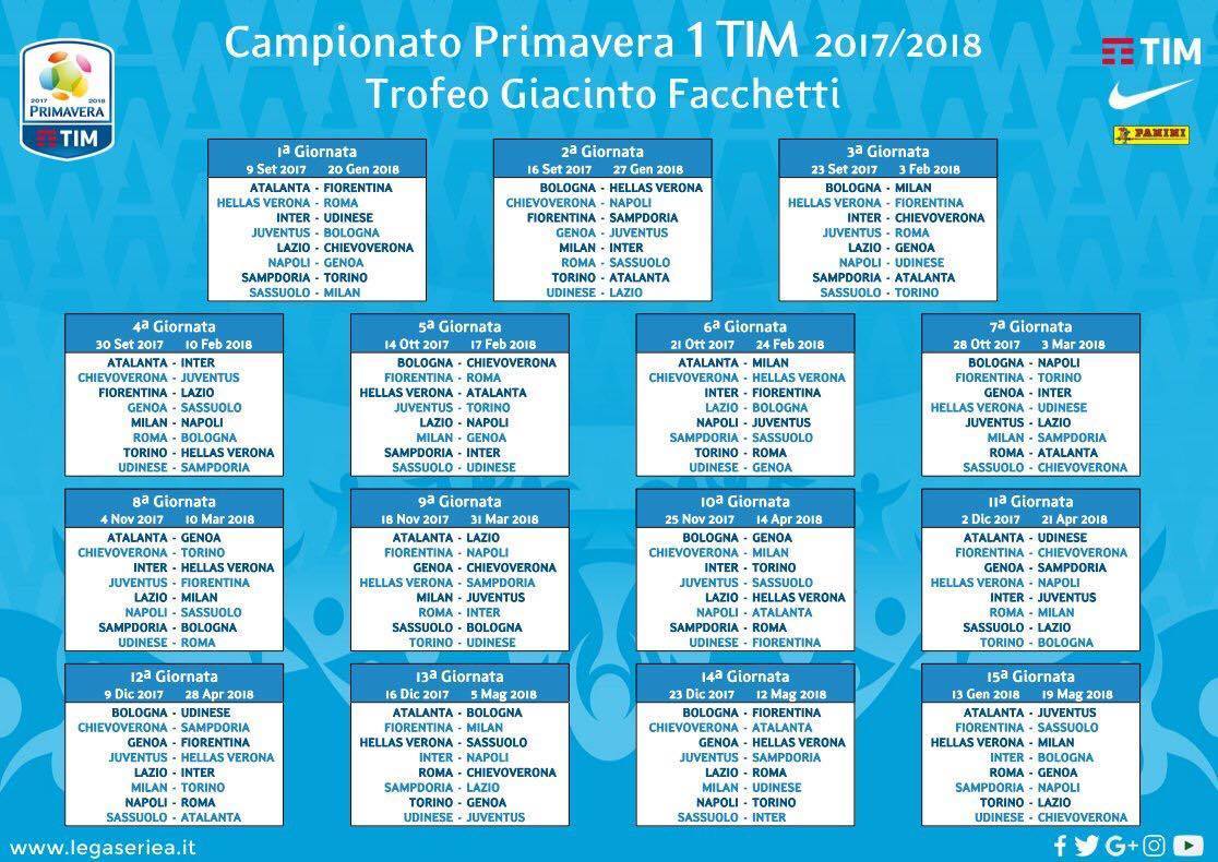 La Lega ha reso pubblico il calendario per il prossimo campionato primavera. Gli azzurrini saranno protagonisti nelle prossime 30 giornate del trofeo Giacinto Facchetti 2017/2018. L’esordio in casa contro il Genoa per poi concludere il girone a casa della Sampdoria.
