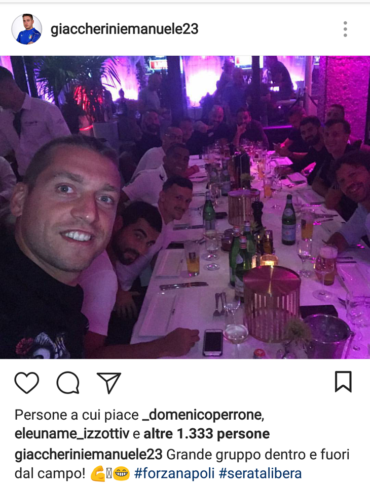 “Un grande gruppo dentro e fuori dal campo!” scrive Giack come didascalia d’una foto che ritrae lui e parte della squadra fuori a cena. Ai ragazzi è stata infatti concessa una serata libera dopo le fatiche dell’Audi Cup.