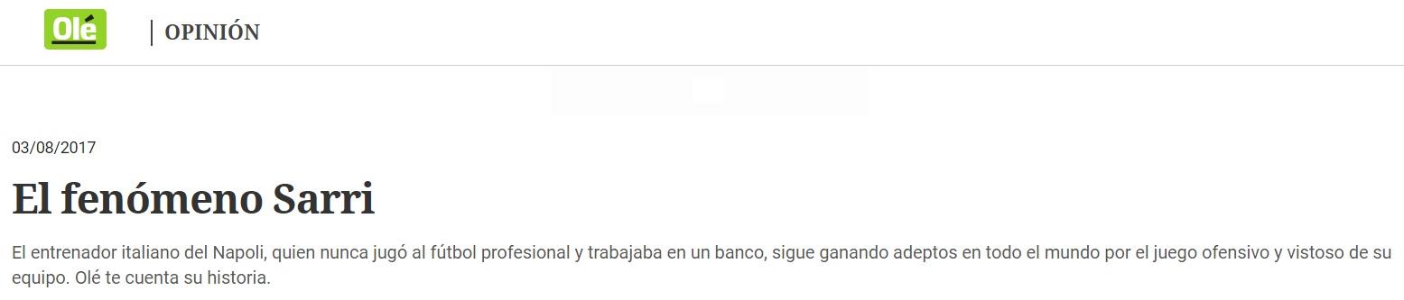 “El fenómeno Sarri”. Questo è il titolo di un articolo del famoso quotidiano argentino Olè, che ha voluto omaggiare l’allenatore del Napoli definendolo un “non italiano”, visto il suo gioco offensivo molto diverso da quello di una squadra italiana tipo.