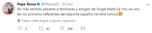 “Le mie più sentite condoglianze agli amici e familiari di Angel Nieto. Se ne va uno dei massimi riferimenti dello sport spagnolo. Terribile notizia”.