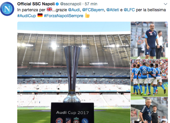 Attraverso twitter, il club azzurro ha anche ringraziato il Bayern Monaco, il Liverpool e l’Atletico Madrid per la “bellissima esperienza” dell’Audi Cup.