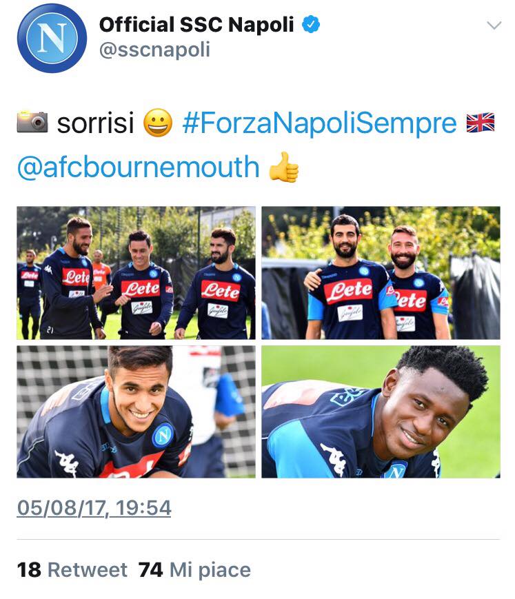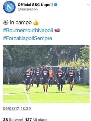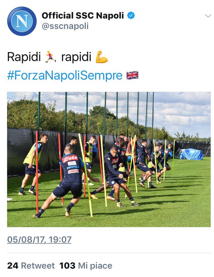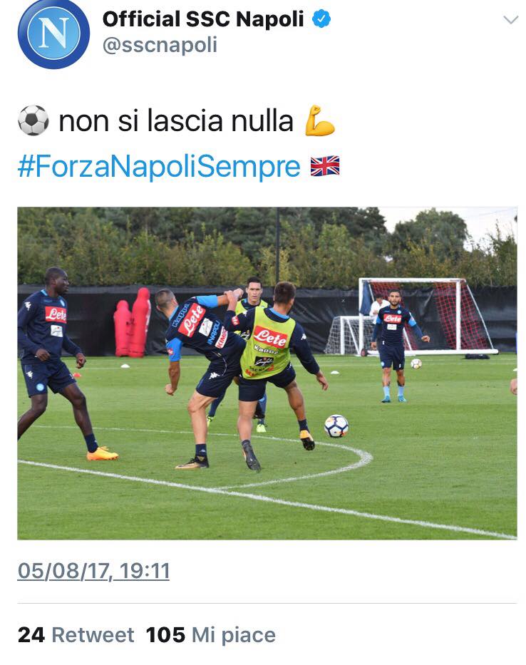 Nella seduta pomeridiana dell’allenamento di oggi si sono viste facce distese e sorridenti, ma allo stesso tempo determinate e cariche per l’impegno di domani e per l’inizio di stagione. Tutto ciò è testimoniato dagli scatti pubblicati sul profilo twitter officiale del Napoli.