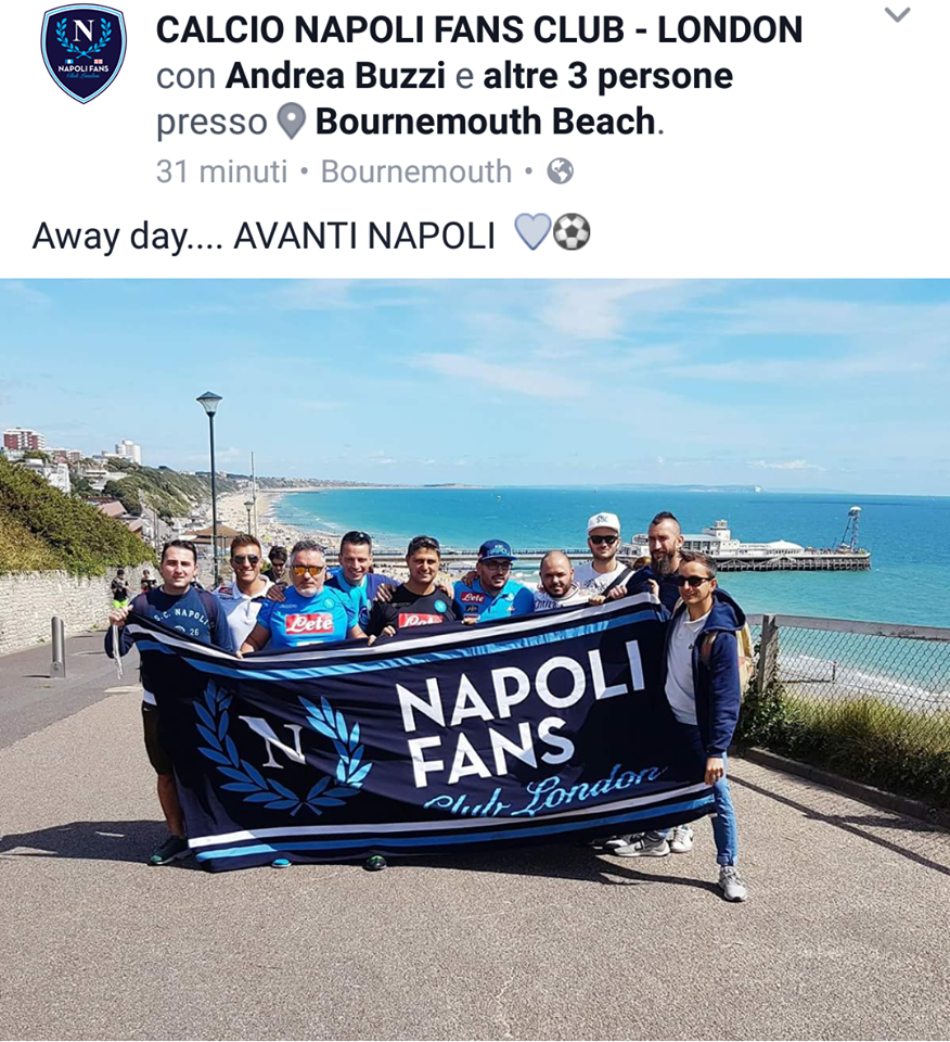 Come il gruppo del Calcio Napoli Fans Club di Londra che tramite la propria pagina Facebook ha postato la foto che lo ritrae nei pressi della spiaggia inglese con la sciarpa rappresentativa.