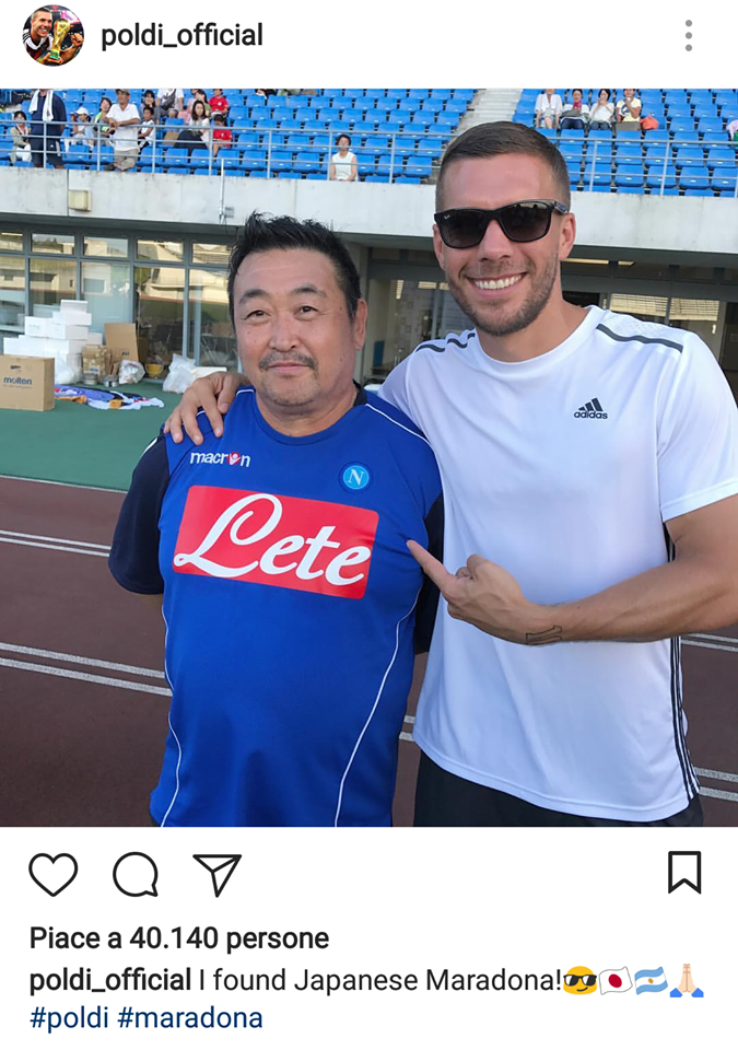 Curiosa la foto postata sul proprio profilo Instagram da Lukas Podolski. Il calciatore tedesco attualmente in forza al Vissel Kobe, club della J1 League, si è fatto immortalare accanto ad un uomo giapponese con la maglia del Napoli.