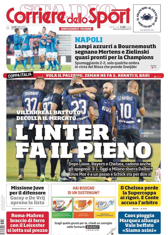 “L’Inter fa il pieno“, apre così Il Corriere dello Sport con in prima pagina l’ottima prestazione della squadra di Spalletti contro il Villarreal e il mercato nerazzurro che decolla: oggi arriva Dalbert, Emre Mor è a un passo e Schick sta per dire sì. In taglio alto spazio al Napoli: “Lampi azzurri a Bournemouth. Segnano Mertens e Zielinski, quasi pronti per la Champions. Spumeggiante 2-2, solo qualche ombra in vista del Nizza che prende Sneijder“.