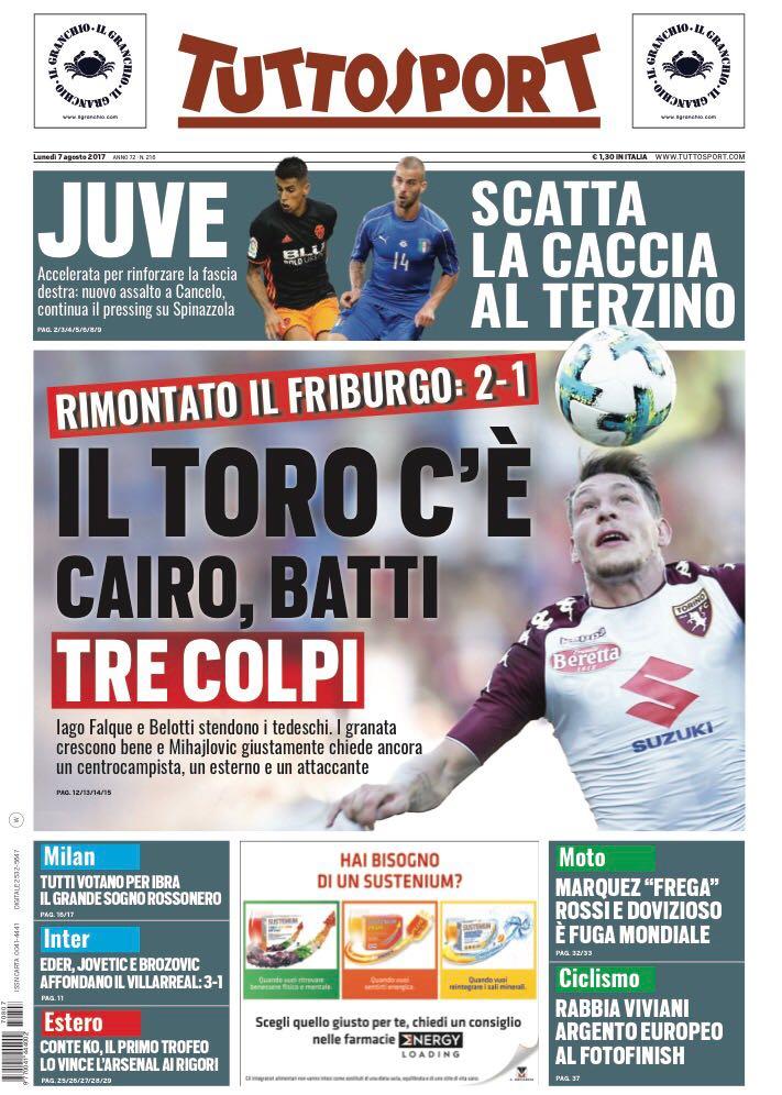 Tuttosport invece apre dando spazio al Torino vittorioso per 2-1 in amichevole sul Friburgo: “Il Toro c’è. Cairo, batti tre colpi“. E in taglio alto: “Juve, scatta la caccia al terzino“, con gli obiettivi Cancelo e Spinazzola.
