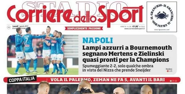 “L’Inter fa il pieno“, apre così Il Corriere dello Sport con in prima pagina l’ottima prestazione della squadra di Spalletti contro il Villarreal e il mercato nerazzurro che decolla: oggi arriva Dalbert, Emre Mor è a un passo e Schick sta per dire sì. In taglio alto spazio al Napoli: “Lampi azzurri a Bournemouth. Segnano Mertens e Zielinski, quasi pronti per la Champions. Spumeggiante 2-2, solo qualche ombra in vista del Nizza che prende Sneijder“.
