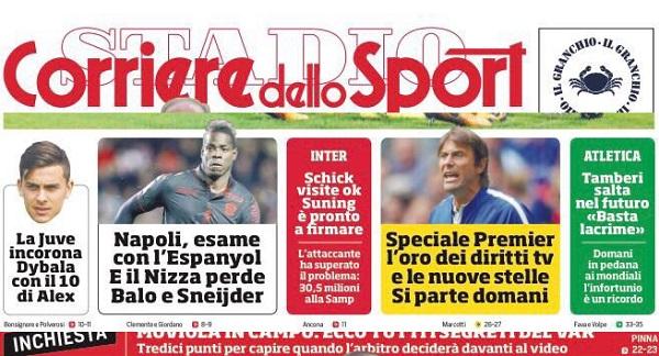 Il Corriere dello Sport apre in prima pagina con: “Milan, febbre Ibra“, aprendo all’ipotesi di un ritorno dell’attaccante svedese in rossonero. In taglio alto la nazionale con il rinnovo del CT Ventura: “Svolta azzurra. Ventura, contratto prolungato: guiderà l’Italia fino al 2020“. In taglio basso spazio anche al Napoli: “Esame con l’Espanyol, e il Nizza perde Balotelli e Sneijder“.