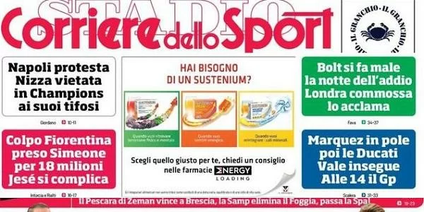 Il Corriere dello Sport apre con: “Fateci godere“, riferendosi a Lazio e Juve. In taglio basso spazio anche al Napoli: “Napoli protesta, Nizza vietata in Champions ai suoi tifosi“.