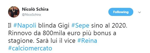 Infatti, secondo quanto riferito dal giornalista della Gazzetta dello Sport, Nicolò Schira, i partenopei avrebbero trovato l’accordo per il rinnovo del contratto di Luigi Sepe. Al calciatore, cresciuto nel vivaio partenopeo, andranno circa 800mila euro a stagione più bonus, oltre al prolungamento fino al 2020 del contratto.