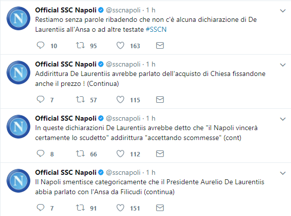AGGIORNAMENTO 12.00 – Il Napoli, attraverso una nota su Twitter, smentisce categoricamente le dichiarazioni di De Laurentiis riportate dall’Ansa.