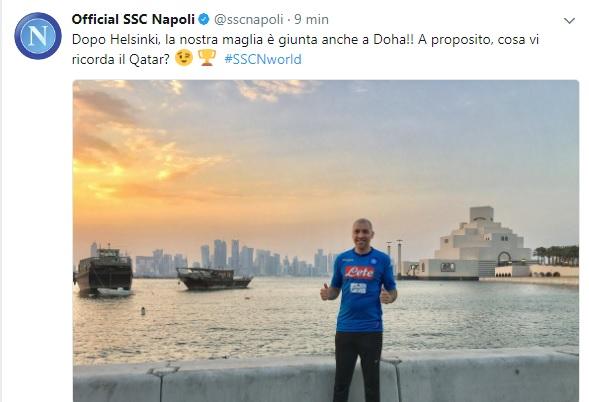 Continuano i post da parte del Napoli su Twitter con foto raffiguranti tifosi da tutto il mondo con la nuova maglia degli azzurri. L’ultima volta i partenopei avevano mostrato un supporters da Helsinki, questa volta la nuova foto arriva direttamente da Doha.