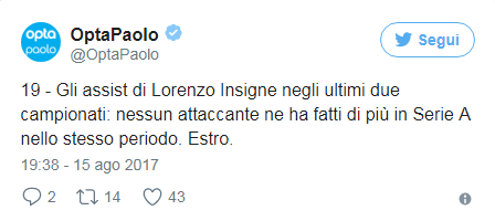 Ennesimo record in casa Napoli, in particolare per il partenopeo Lorenzo Insigne. L’attaccante azzurro, autore di una stagione eccellente, è il giocatore offensivo che, in Serie A, può vantare il maggior numero di assist vincenti nel corso degli ultimi due campionati: ben 19, come ricorda l’agenzia Opta. Di seguito, il tweet che riporta la notizia.